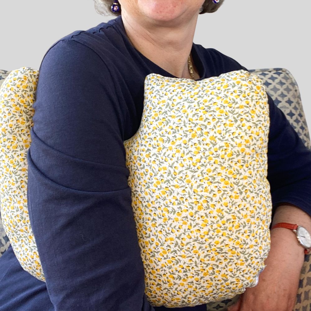 I know what people need so my pillows are made of colourful cotton fabrics, polyester filling and are fully reversible and fit comfortably under either armpit.