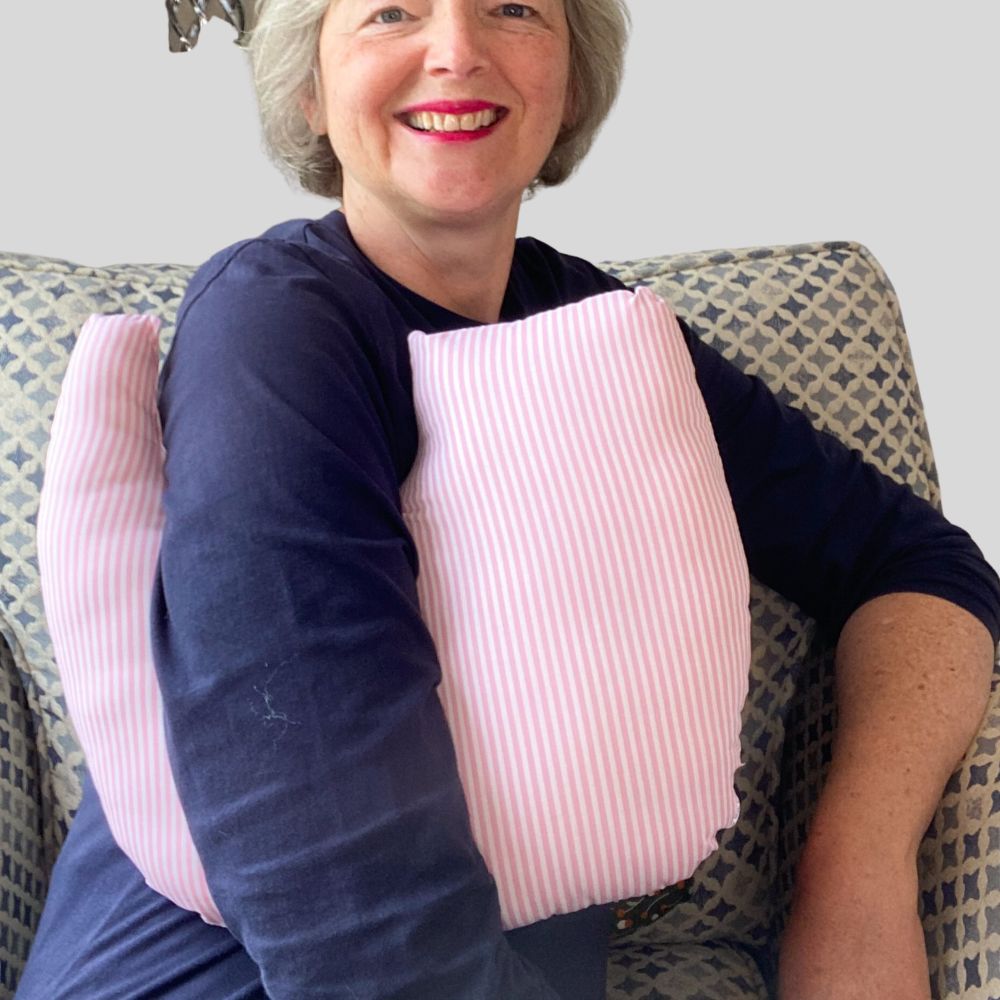 I know what people need so my pillows are made of colourful cotton fabrics, polyester filling and are fully reversible and fit comfortably under either armpit.