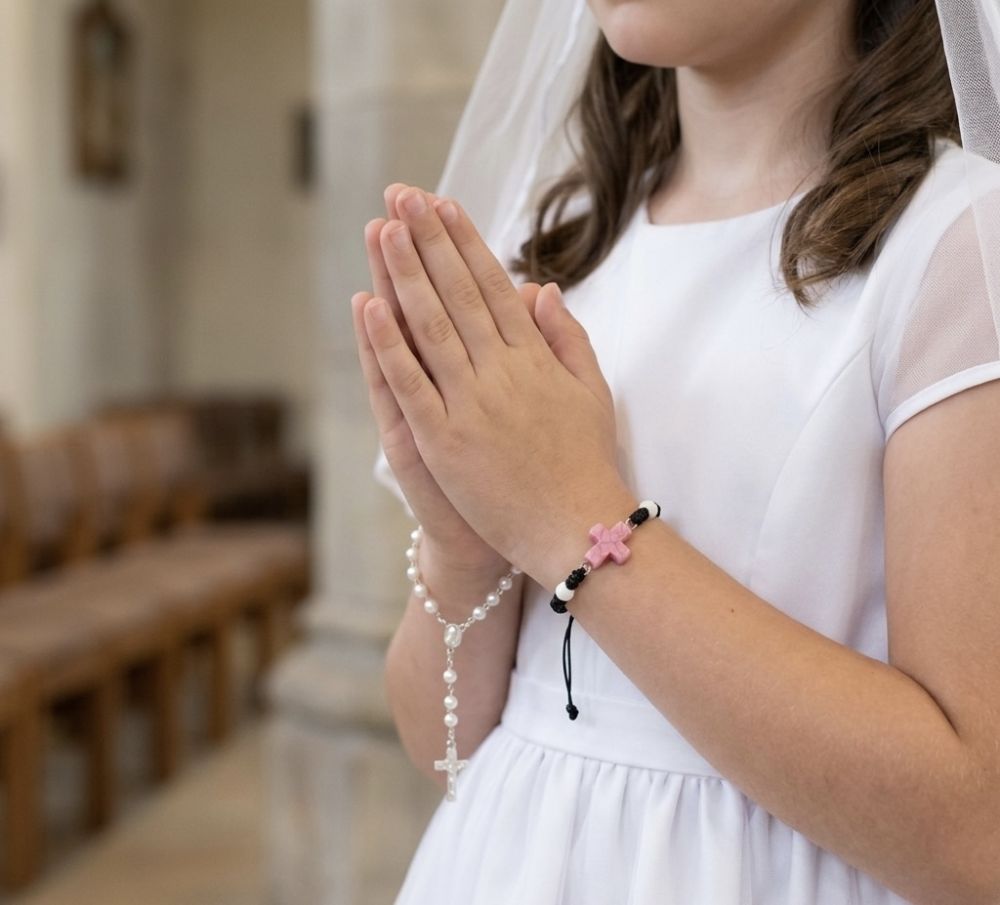 Celebrate faith and special moments with this elegant adjustable cord bracelet featuring a vibrant colour quartz cross and delicate ceramic beads. Perfect as a meaningful first communion or confirmation gift, this bracelet symbolizes devotion and grace. The adjustable design ensures a comfortable fit for all ages, making it a versatile accessory for everyday wear or religious occasions. Presented in a white organza gift bag, it’s ready for gifting and adds an extra touch of elegance.