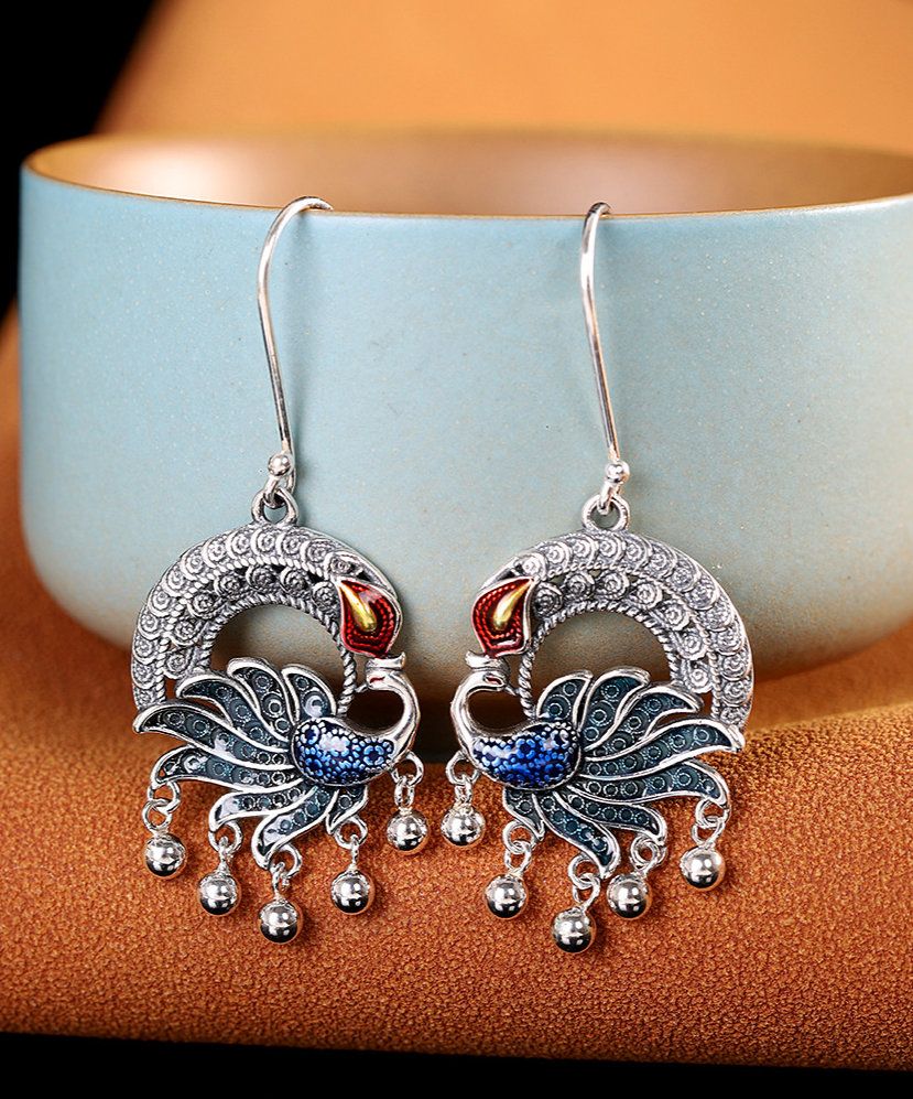 These exquisite Ancient Burnt Blue Peacock Filigree Tassel Sterling Silver Earrings from Silver Fountain blend retro style with timeless elegance, making them a perfect accessory for any ensemble. Meticulously crafted with intricate filigree detailing, these statement earrings are great as a gift for someone special or as a lavish treat for yourself.