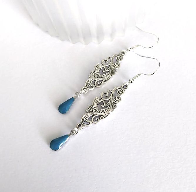 Beautiful antiqued silver filigree earrings, with silver tone drops enamelled in petrol blue. Suspended from silver plated, nickel free ear hooks. Lightweight, bespoke, elegant and comfortable to wear. Perfect for everyday wear or for special occasions. Free shipping!