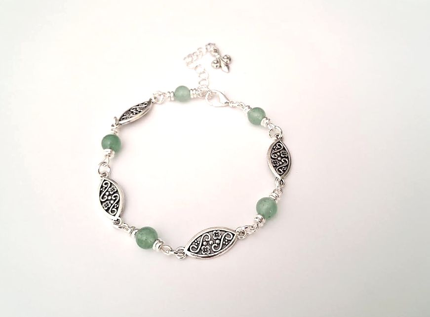 A beautiful antique silver, natural gemstone bracelet, (avemturine) handmade in Ireland from quality materials.  This gorgeous bespoke piece is elegant, light and comfortable to wear, suitable for day or evening wear. Perfect for gifting, or a personal treat!  It arrives in a pretty velvet pouch, and has free shipping!