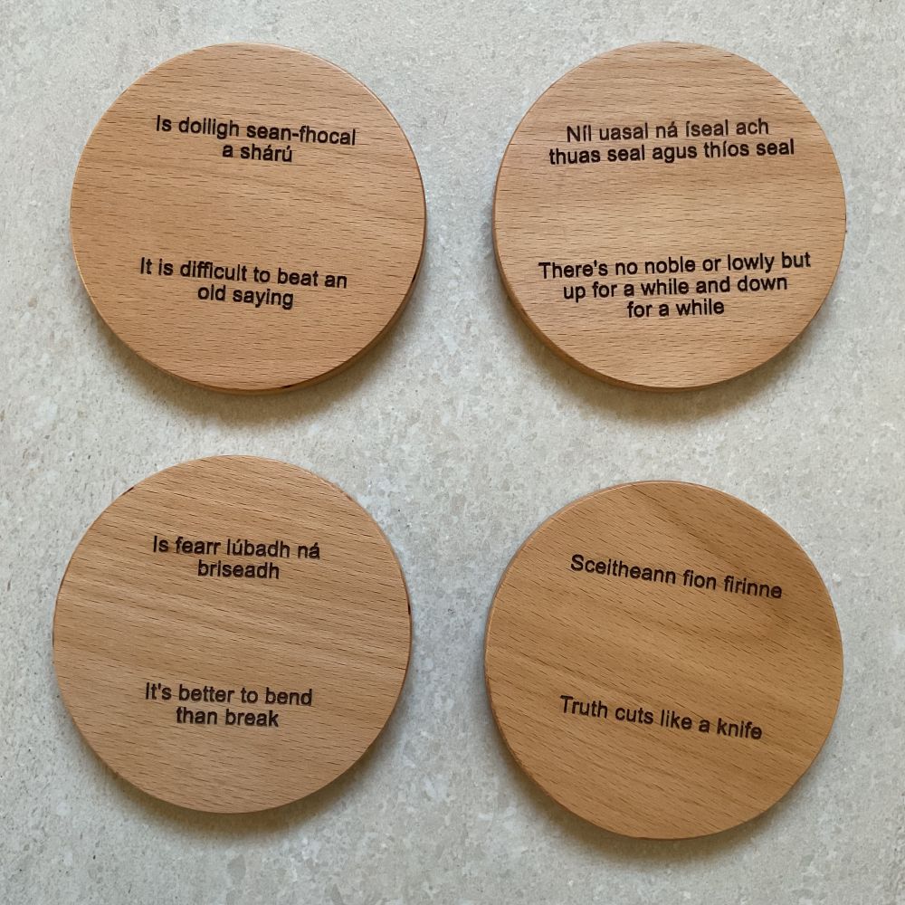 These bilingual coasters capture the essence of the old Irish proverb ‘is doiligh sean-fhocal a shárú’ (It is difficult to beat an old saying). You have a choice of the linguistic gems of our ancestors where common sense intertwines with the lyrical wisdom of the Irish language.