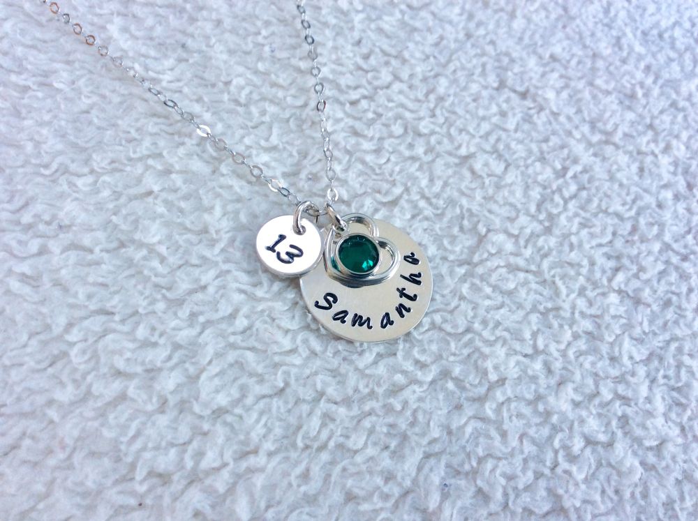 Personalised birthday jewellery name necklace birthday gift idea gift for her and any girl with their name necklace hand crafted with their birthstone and a separate disc with the special birthday number.