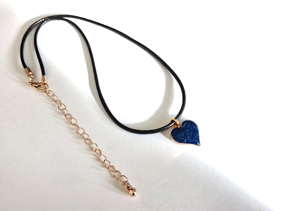 A beautiful heart pendant, made in Ireland with quality materials. A gorgeous gold tone heart, beautifully enamelled in a deep blue. It's suspended from a sleek black cord with gold tone connectors and ext. chain. Light, easy to wear. Great for everyday wear. Perfect for gifting, or a personal treat! Free shipping!