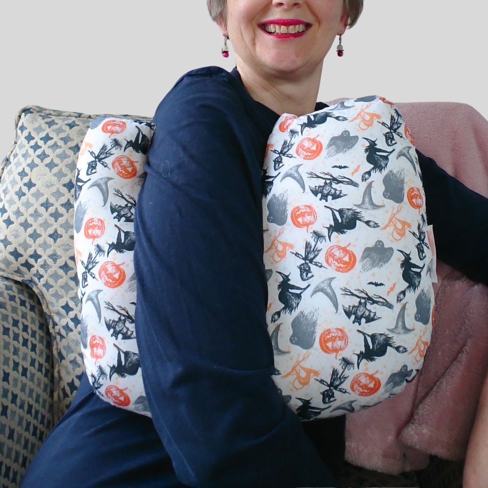 This pillow reaches mid chest in width, so it will easily cover the surgery area. It measures 43cm wide X 37cm long and 10 cm in depth. This has Halloween witches, pumpkins and ghosts print fabric and is soft and breathable. All pillows come with a made with love by Rodgerson Handcraft label and are reversible.