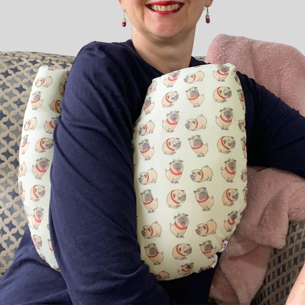 This pillow reaches mid chest in width, so it will easily cover the surgery area. It measures 43cm wide X 37cm long and 10 cm in depth. This pugs with red collars fabric is soft and breathable. All cushions come with a made with love by Rodgerson Handcraft label and are reversible.