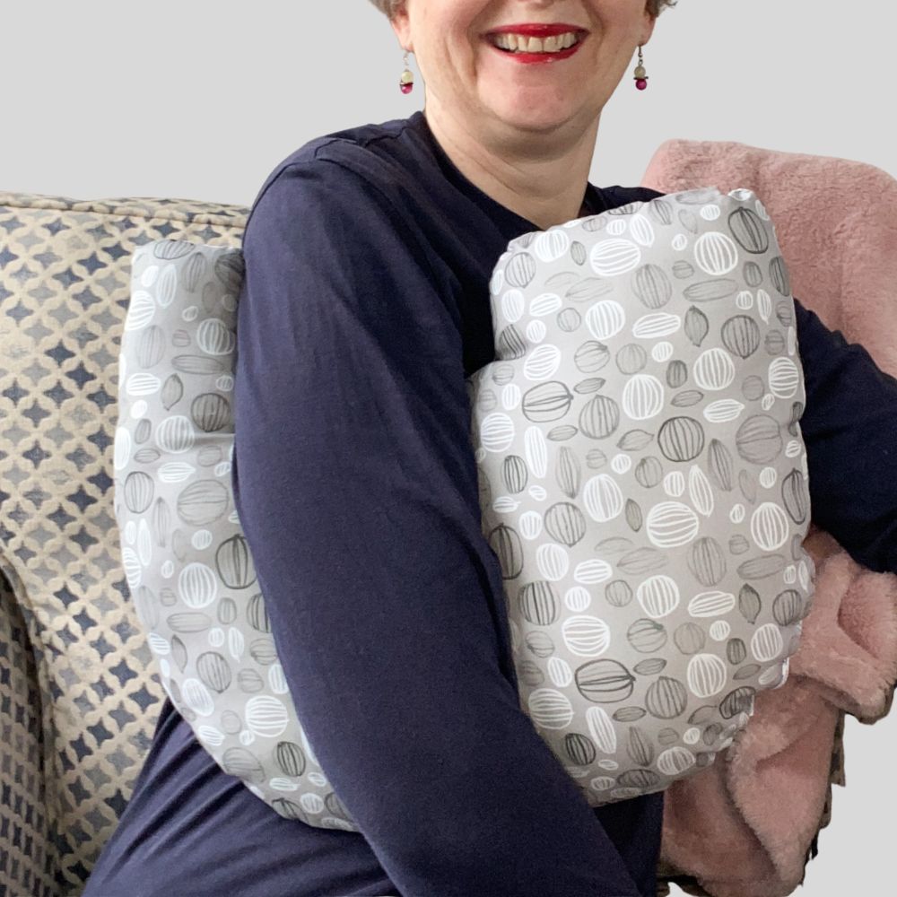 I know what people need so my pillows are made of colourful cotton fabrics, polyester filling and are fully reversible and fit comfortably under either armpit.