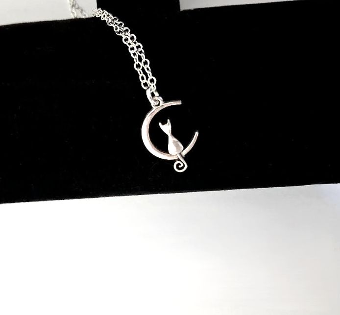 Gorgeous polished silver tone pendant, which has a cat sitting on a moon (the pendant is approx. 1.9cm/0.75in in length). It is suspended from a silver plated chain (approx. 45.7cm/18ins in length, plus extension chain.. approx. 5cm/2ins in length). Perfect for cat lovers. It arrives in a pretty organza bag, and has free shipping!