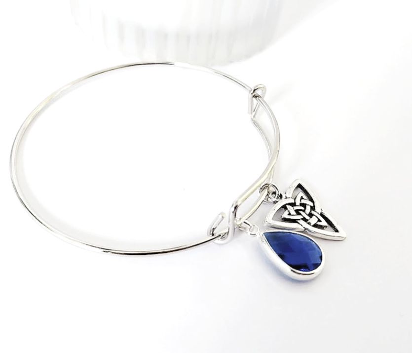 A beautiful polished stainless steel adjustable bracelet, with a gorgeous antique silver celtic charm and a sparkly silver framed faceted glass drop. Light, elegant and easy to wear. Elevate your style with this beautiful bespoke piece. It arrives in a pretty organza bag, and ... has free shipping!