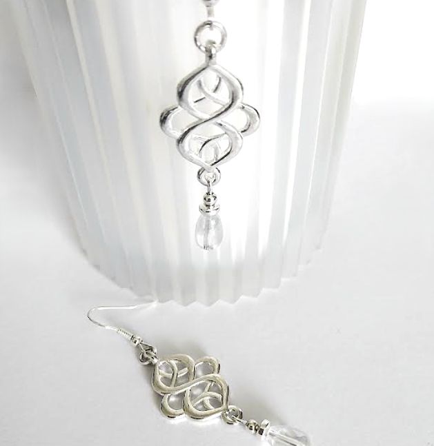 Handmade earrings, created with silver plated celtic knots, silver plated beads and iridescent clear glass drops. They are suspended from silver plated, nickel free ear wires, suitable for sensitive ears. Lightweight, comfortable to wear and very versatile.. Elevate your style with these gorgeous bespoke pieces.. They arrive in a pretty organza bag, and have free shipping.