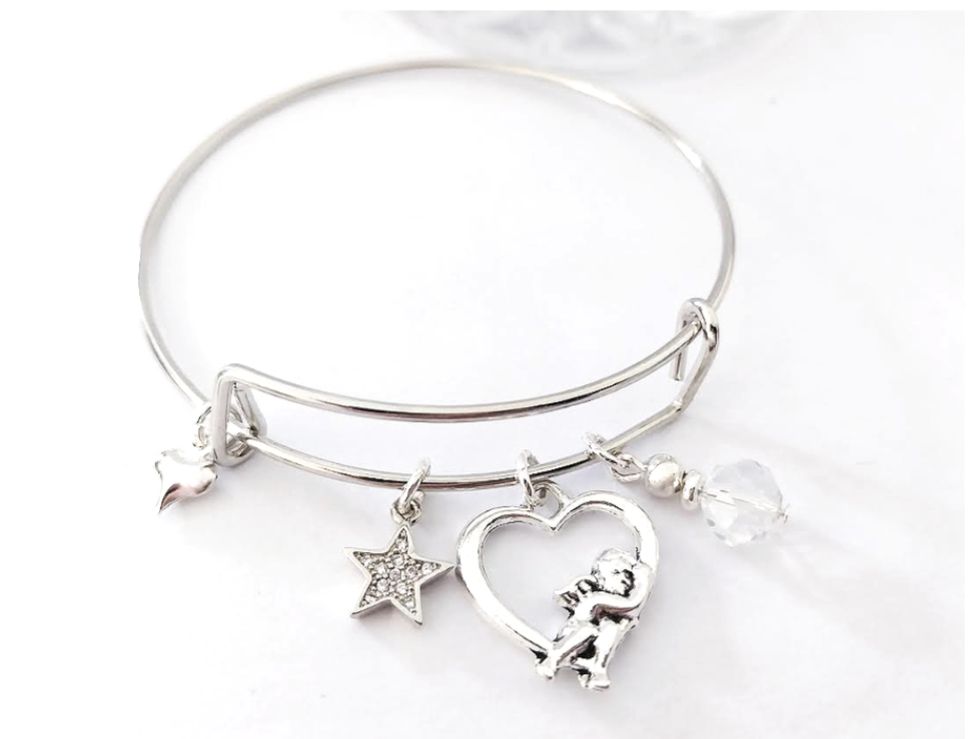 A beautiful bangle in polished stainless steel, with a gorgeous antique silver heart/cherub charm, a tiny diamonte star, crystal glass bead and a mini silver plated heart charm. Beautiful, adjustable, lightweight and easy to wear. A perfect bracelet for Christmas/gifting/stocking filler. It arrives in a pretty organza bag, and has free shipping!