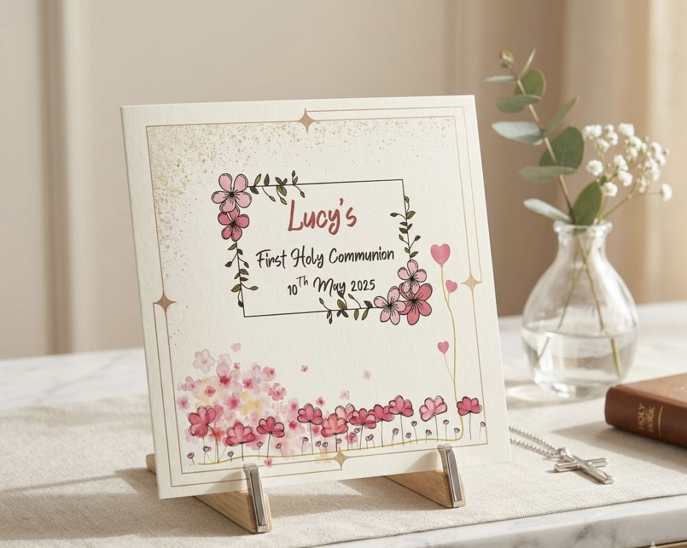 Celebrate a special milestone with our personalised First Communion card for girls. This beautiful design features delicate details and a heartfelt message to mark this important occasion. Customise with her name for a truly unique keepsake. A meaningful and memorable way to show your love and support.