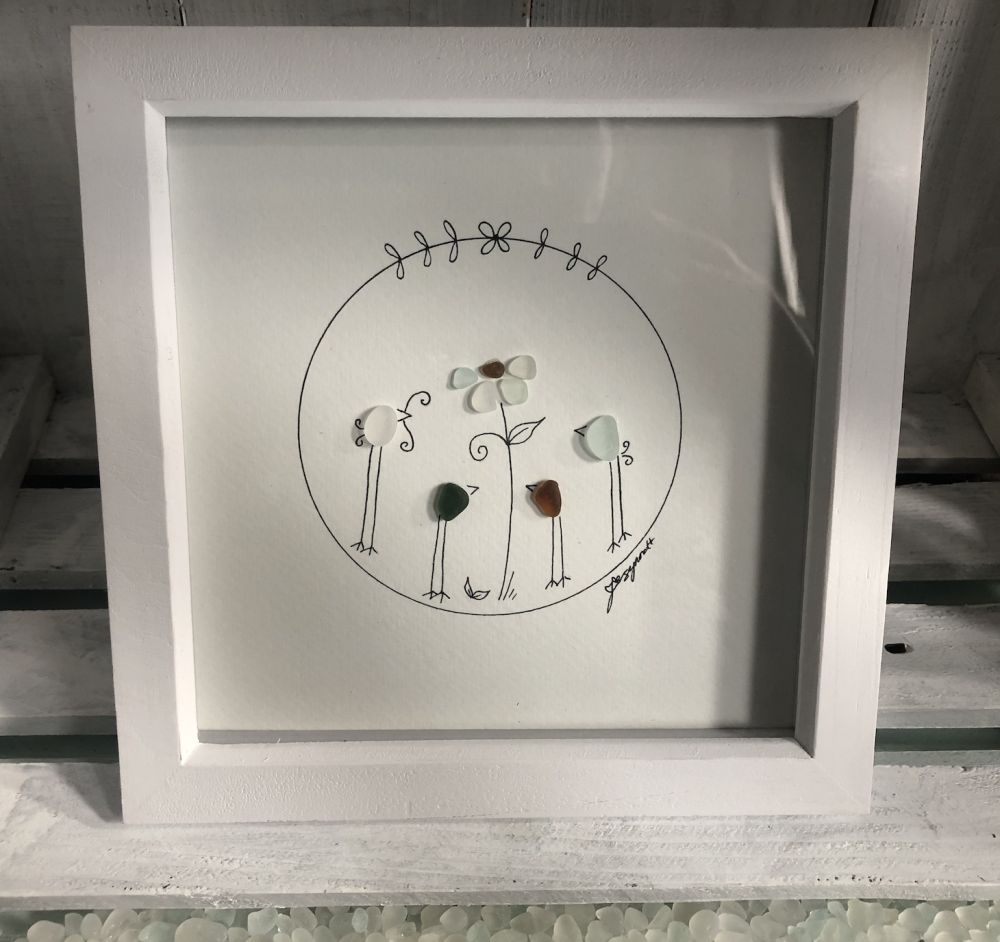 Family together time. Made from geniune tumbled seaglass collected by me and my family from Seaham beach. White frame 9 inches X 9 Inches.
