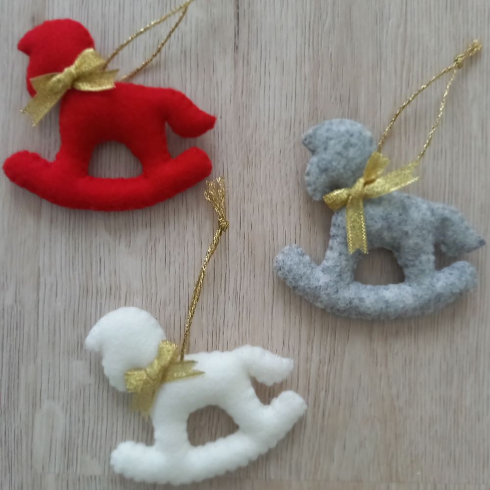 Set of 3 Handsewn felt rocking horse — a timeless Christmas keepsake in red, creamy white or marl grey.