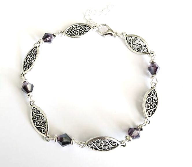 Handmade antique silver filigree bracelet, created with faceted crystal glass beads in a deep purple, silver plated clasp and extension chain. The bracelet is approx.20.32cm/ 8ins in length, plus extension chain approx. 3.8cm/1.5ins. Elevate your style with this beautiful bespoke piece. It arrives in a pretty organza bag, and has free shipping!