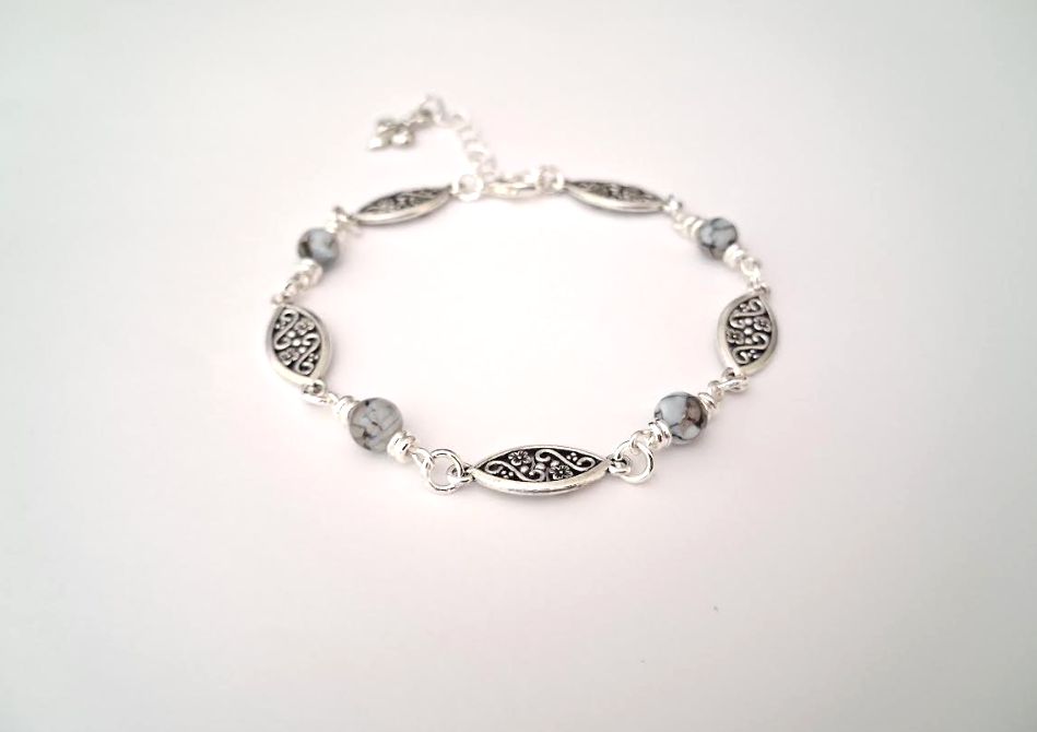 A beautiful natural gemstone bracelet, handmade in Ireland from quality materials. Created with antique silver links, silver plated beads, clasp and extension chain, and gorgeous natural jasper gemstones. This beautiful bespoke piece is elegant, light and comfortable to wear, suitable for day or evening wear. Perfect for gifting, or a personal treat! It is approx. 20.3cm/8ins in length, plus ext chain approx. 3.8cm/1.5ins. It arrives in a pretty velvet pouch, and has free shipping!