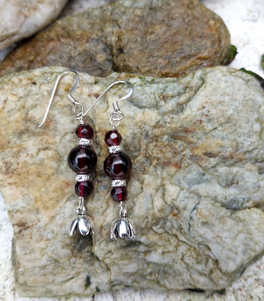 Handmade earrings in Sterling Silver. 6mm smooth and 4mm faceted Garnet beads drops from and earwire. A sweet flower is at the bottom. Total length of the drop is 35mm