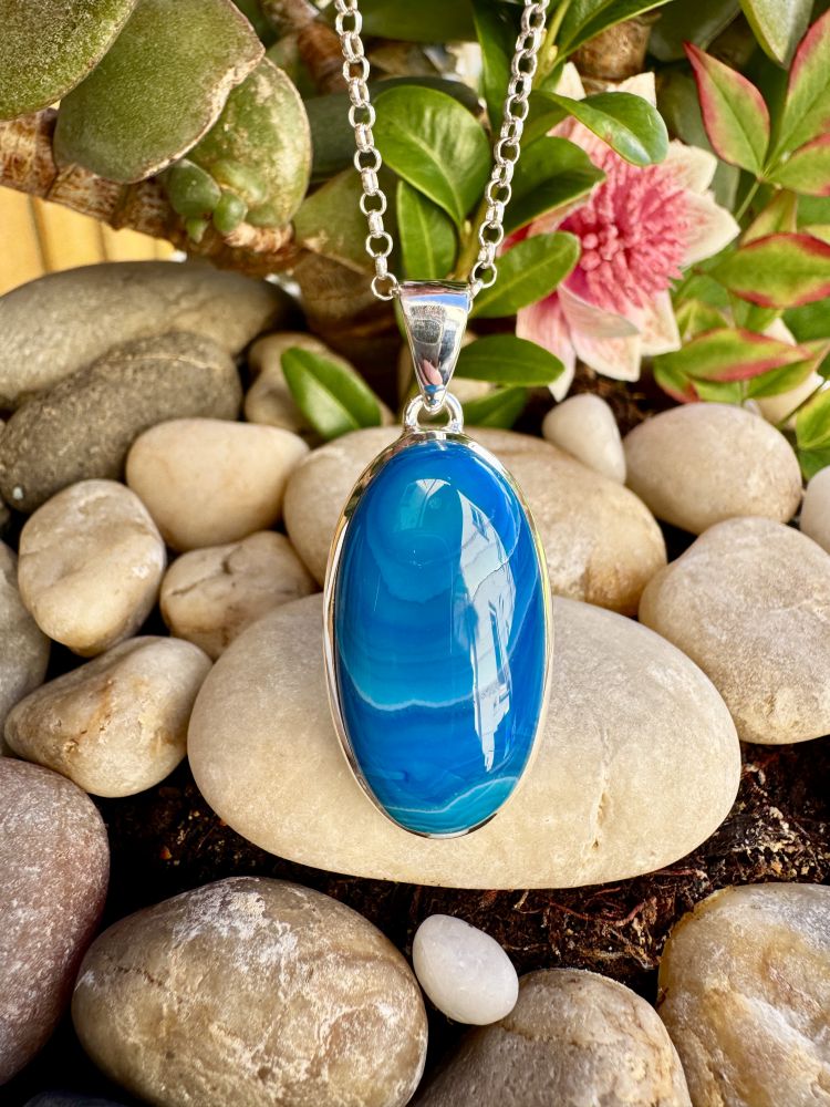 This beautiful Blue Hues Botswana Agate Sterling Silver Necklace is a unique handmade piece that will make a statement with any outfit. The gorgeous blue hues of the Botswana Agate stone are bezel set in sterling silver, perfect for adding a touch of class to any look, this necklace is a one-of-a-kind piece and a great addition to any jewelry collection.