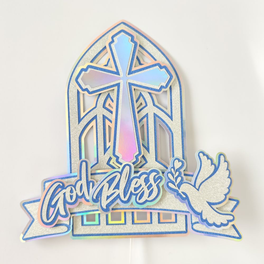 - 1 x Handcrafted silver holographic God Bless cake topper with church window, cross & dove
