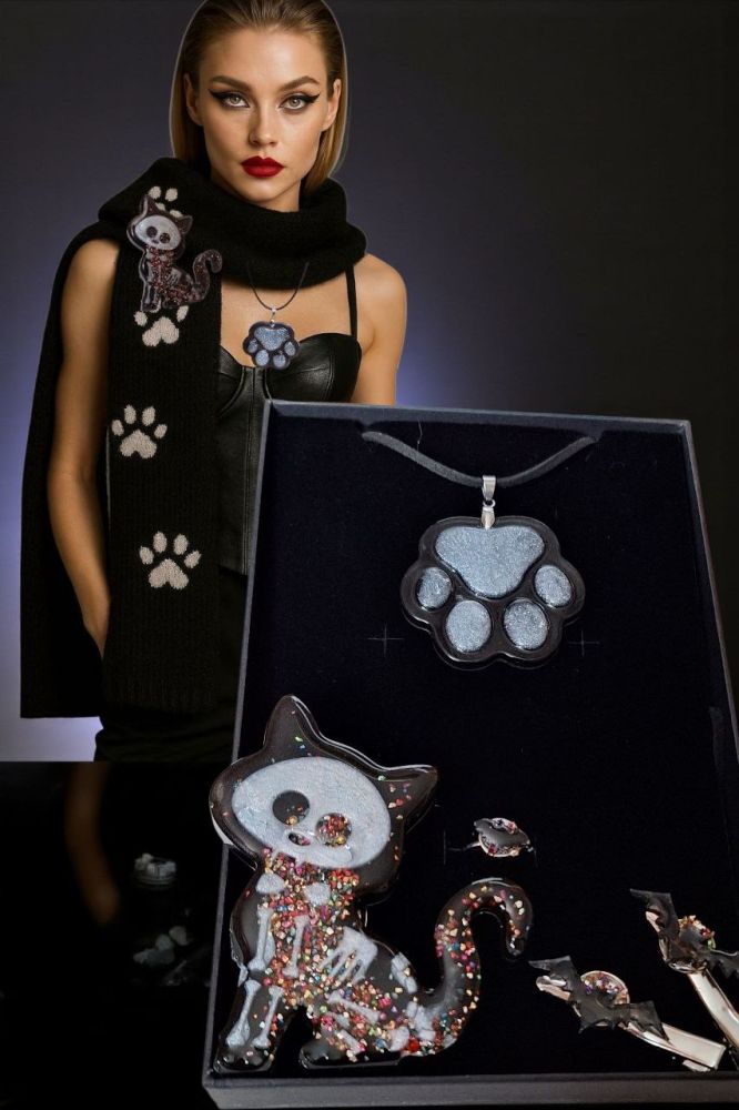 Halloween Series: Black Cat Jewelry Set – Resin Brooch, Pendant, Clips & Ring