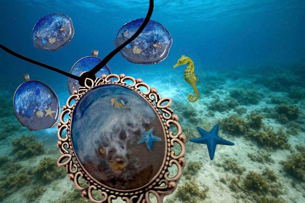 Transport yourself to the sea with these beautiful handcrafted pendants. Each piece is a mini seascape, featuring elements like starfish, tiny shells, waves, and even a seahorse – all embedded in epoxy resin.
