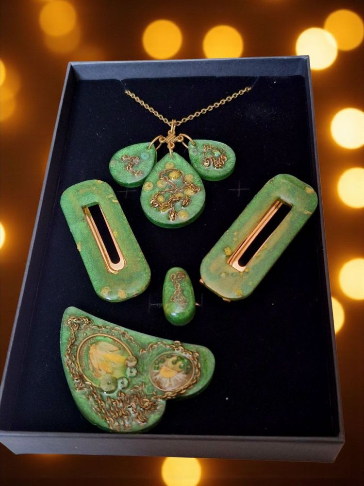 Handmade Resin Jewelry Set with Dried Flowers – Necklace, Brooch, Hair Clips & Adjustable Ring