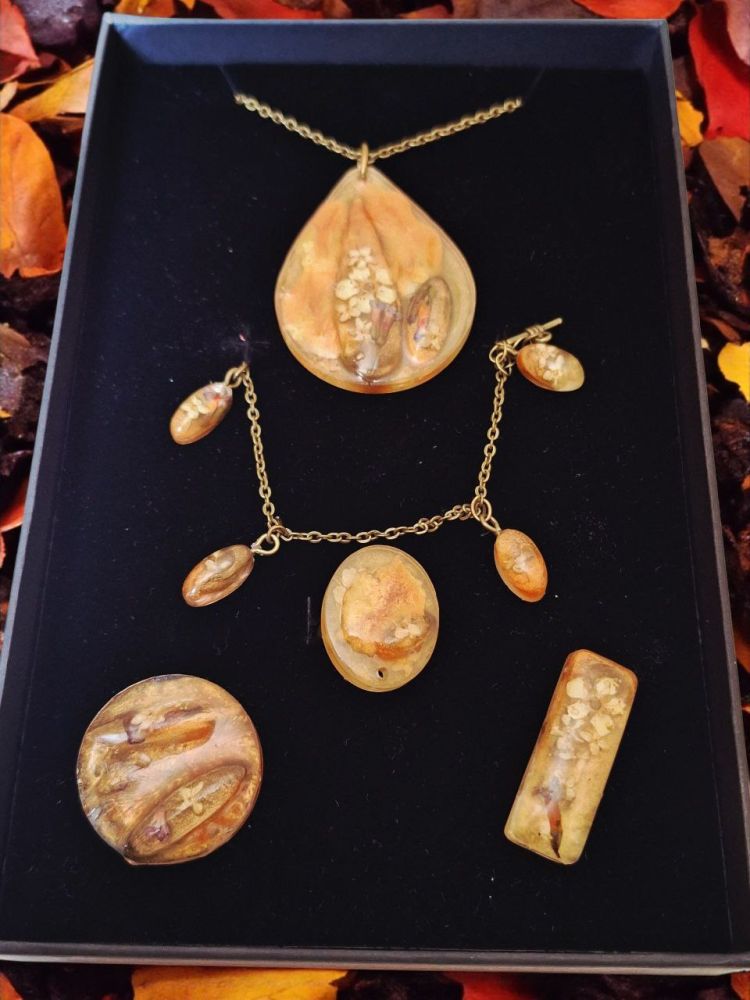 Handmade boho-style jewelry set with real dried flowers in warm amber tones. Includes pendant, ring, bracelet or anklet, and two brooches.