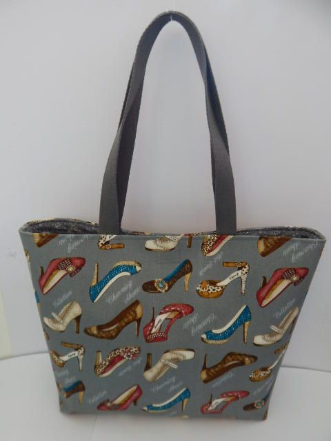 Large ladies tote bag. Shoe print on a grey backround. Light weight and roomy.