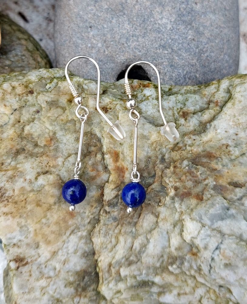 Handmade earrings with a 6mm round grade AAA Lapis Lazuli bead. The Lapis drops from a Sterling Silver bar.