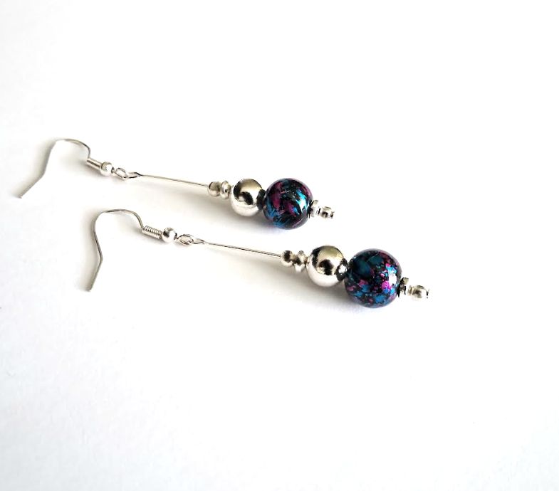 Beautiful earrings, handmade in Ireland with quality materials. Created with silver plated beads and wires, and gorgeous painted glass beads with splashes of black, deep blue and deep pink. They are suspended from silver plated, nickel free ear hooks (suitable for sensitive ears). Sterling silver ear hooks are available, if preferred... see options. Bespoke, elegant, great for day or evening wear, lightweight and comfortable to wear. Perfect for gifting, or a personal treat! They arrive in a pretty organza bag, and have free shipping!