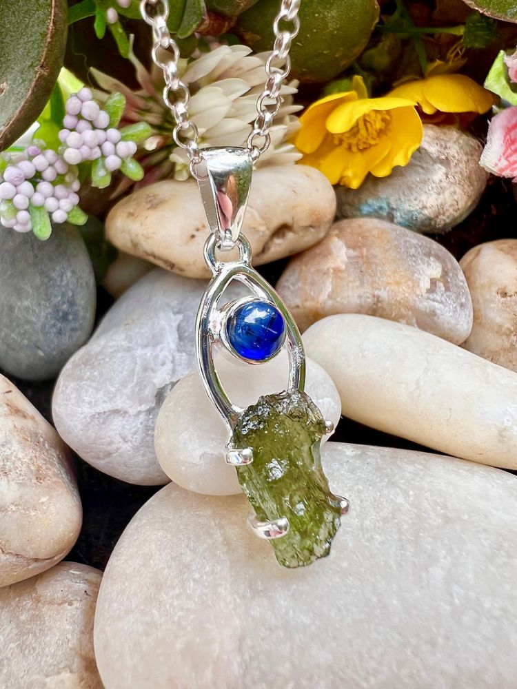 Genuine Moldavite and Blue Kyanite Sterling Silver Necklace