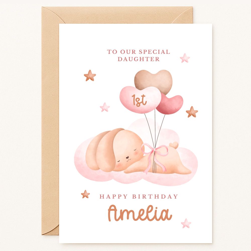 This sweet personalised 1st birthday card features a cuddly bunny sleeping on pink clouds, surrounded by pastel stars and heart-shaped balloons marked "1st". Add your child’s name and change the relation to suit your family—perfect for daughters, nieces, godchildren or grandchildren. A gentle and heartwarming keepsake they’ll treasure forever.