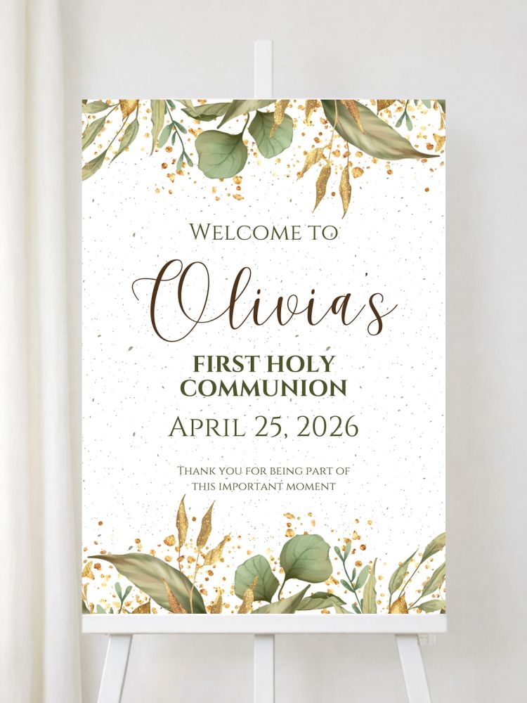 Personalised First Holy Communion Welcome Signs with Eucalyptus & Gold Accents