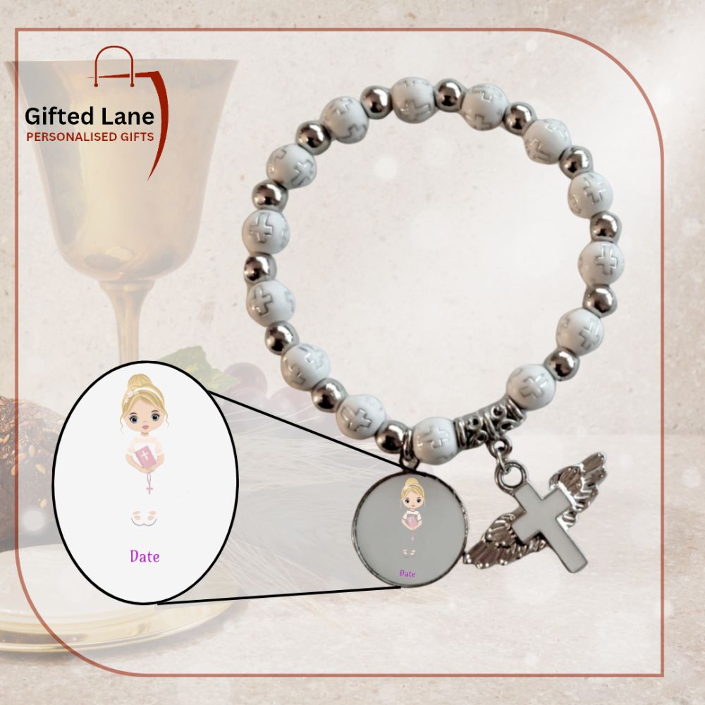 Personalised First Holy Communion Rosary Beads Bracelet is a personalised gift accessory and a keepsake of a special day. They can be personalised with a picture and with a date or name on them. Another special personalised gift from Gifted Lane