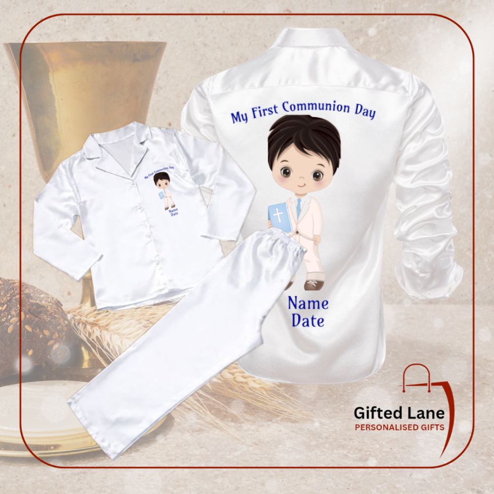 Personalised First Holy Communion White Satin Shirt and Trousers Pyjamas is a personalised gift and a keepsake of a special day. They can be personalised on both sides with any picture or text on them and with a date or name on them. Another special personalised gift from Gifted Lane.