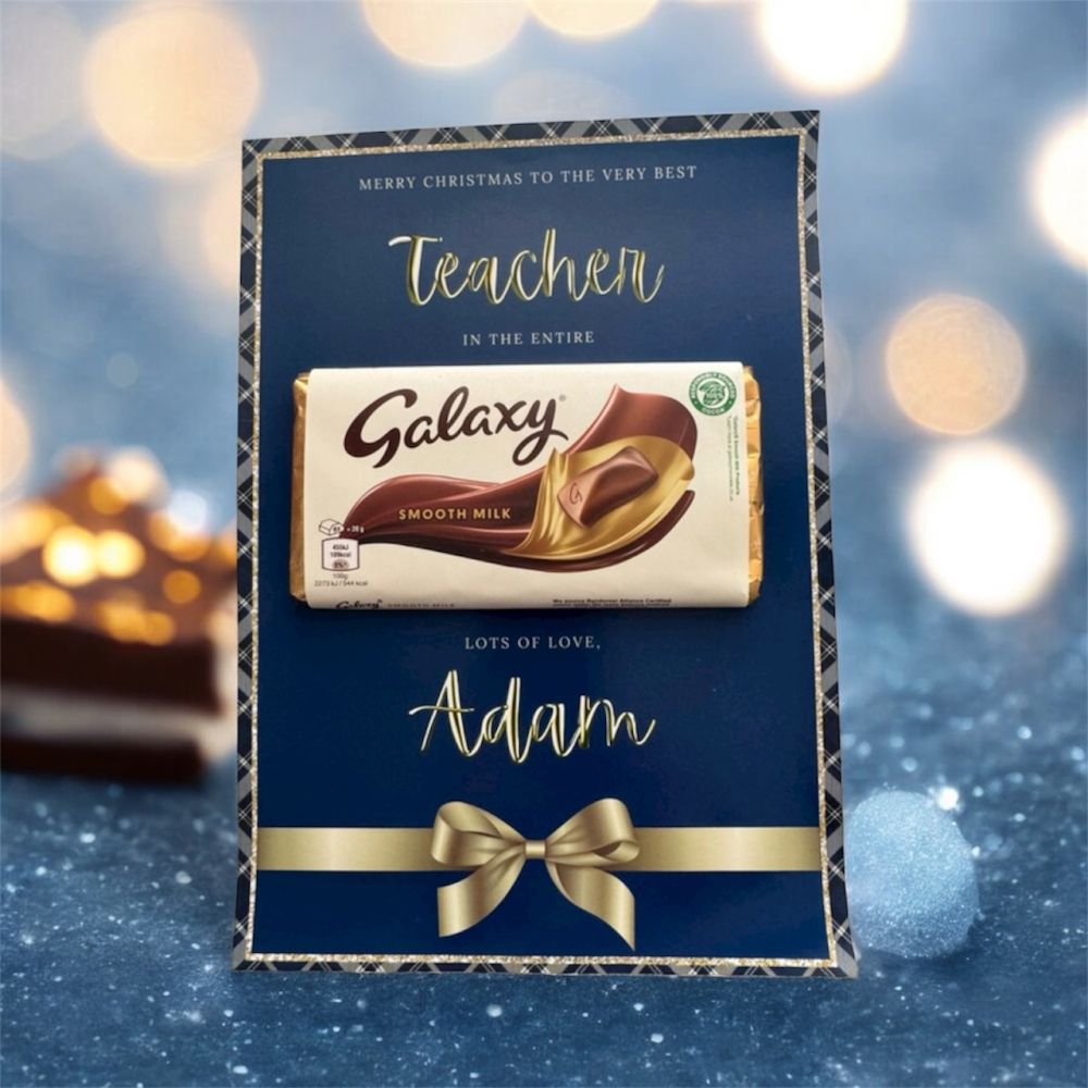 A4 printed 300gsm gloss card with a 100g Galaxy chocolate bar. Perfect for Teachers, Nanny, Grandad, Aunty....the list is endless. Comes in an A4 cellophane bag ready for gifting.
