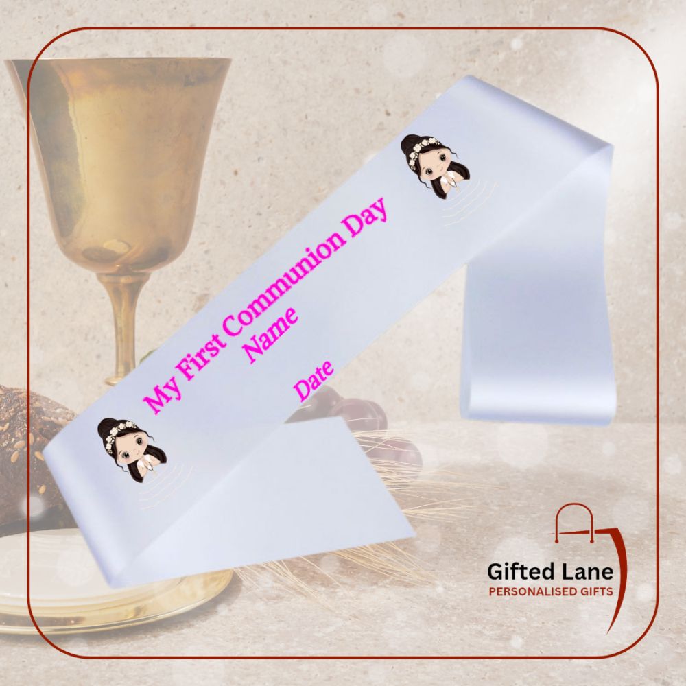 These personalised First Communion Sash are a fun and a unique personalised gift to accessorise your Communion Dress.