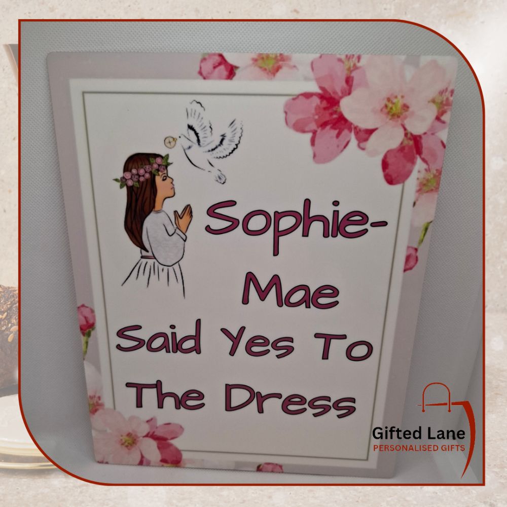 Did you just say yes to your First Communion Dress. These personalised First Communion Yes to the Dress Signs are a fun and a unique personalised gift to show everyone that you have said yes to your Communion Dress. They can be personalised with any picture or text and with a date or name on them. Another special personalised gift from Gifted Lane