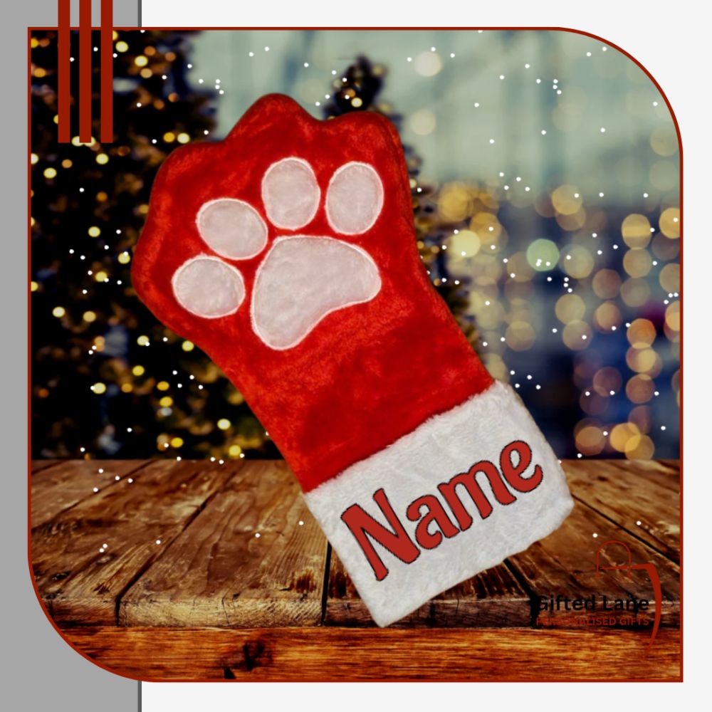 Personalised Pet Santa Stocking is a special personalised gift for a family pet or pet lover. These Pet Santa Stocking are red in colour with a paw print on the main part of the stocking and the top of the stocking can be personalised with any picture or name or text on them. Another special personalised gift from Gifted Lane and would make an ideal present for someone special this Christmas.