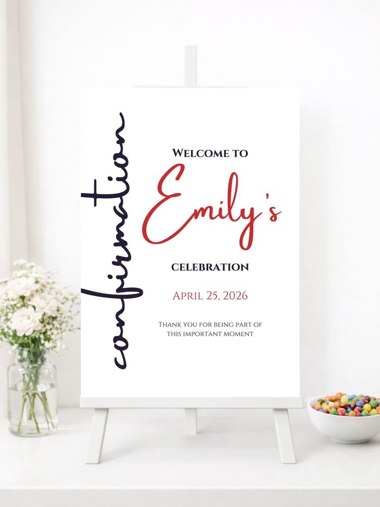 Make a striking statement at your child's celebration with our beautifully designed personalised welcome signs. Featuring bold red script typography with vertical "Confirmation" calligraphy alongside your child's name in elegant flowing letters, these premium prints combine modern style with heartfelt warmth for your special celebration.