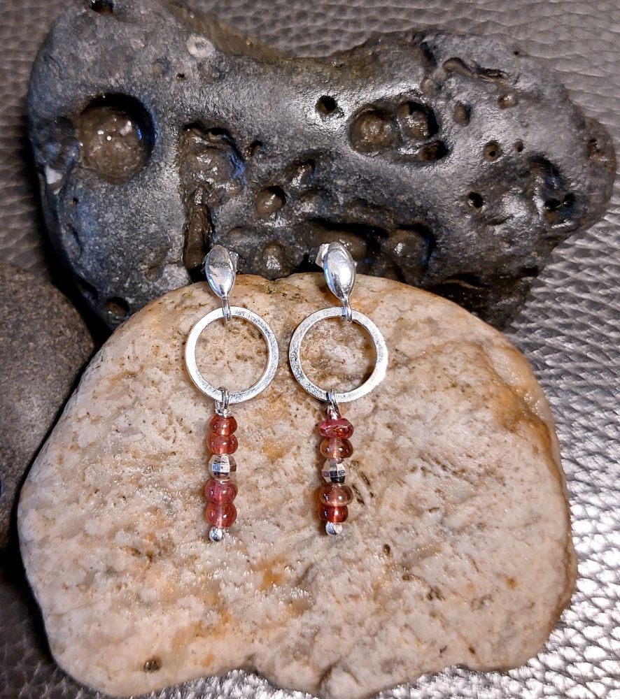 Handmade Sterling Silver Earrings with a stud fitting. Pink Tourmaline and Sterling Silver beads drop from an 8mm round circle. The total length of drop is 30mm.