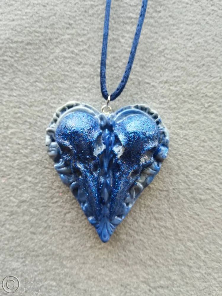 ROYAL BLUE Lovebirds Raven Skull Heart Cameo Cabochon - READY 2 SHIP Necklace - Glitter & Mica Powder, Birdskull - Hand carved and made with resin