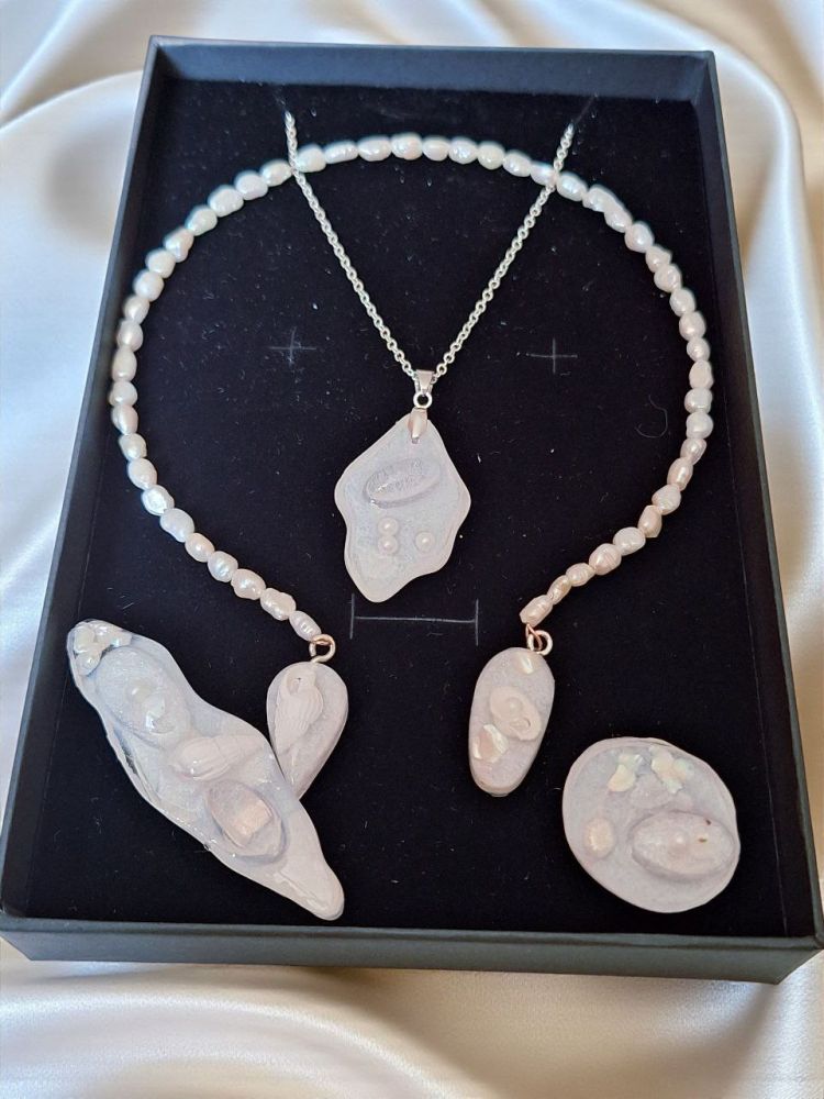Choker, pendant, ring & brooch in resin with pearls & shells. Comes in elegant gift packaging.