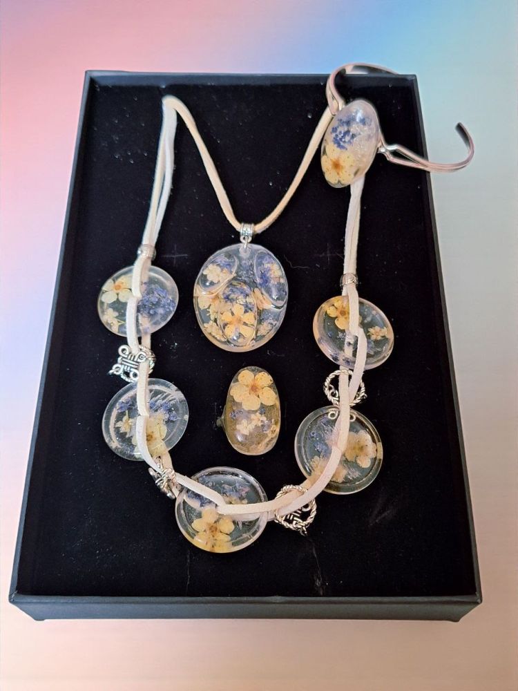 Botanical jewelry set with real pressed flowers in resin. Includes ring, bracelet, necklace & pendant. Handmade & ready to gift.