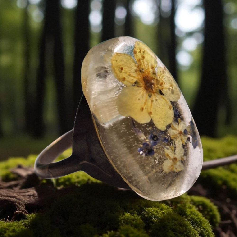 This elegant oval ring features pressed flowers preserved in clear, glossy resin. Its warm bronze tone base is adjustable and fits most sizes (inner diameter ~17 mm).