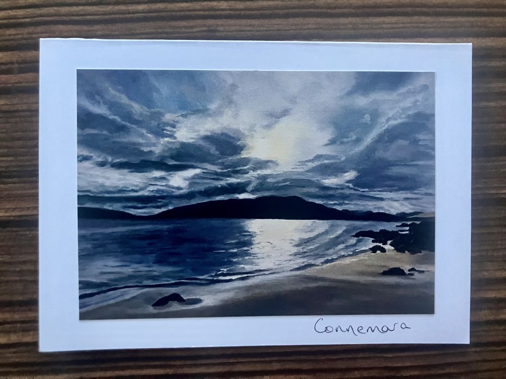 Signed prints of my own original artwork, inspired by the twilight over the shores of Connemara. The piece reflects the calm, beauty, and subtle colours of the west of Ireland at dusk. Each print is carefully attached to a 5×7 inch blank greeting card, perfect for sending, gifting, or framing. Every piece is personally signed.