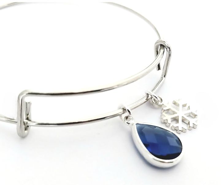 A gorgeous polished stainless steel adjustable bracelet, with a silver plated snowflake charm, and a silver framed, faceted glass bead in deep tblue. Lightweight and comfortable to wear….Perfect for Christmas/Gifting/Stocking filler...It arrives in a pretty organza bag, and has free shipping!