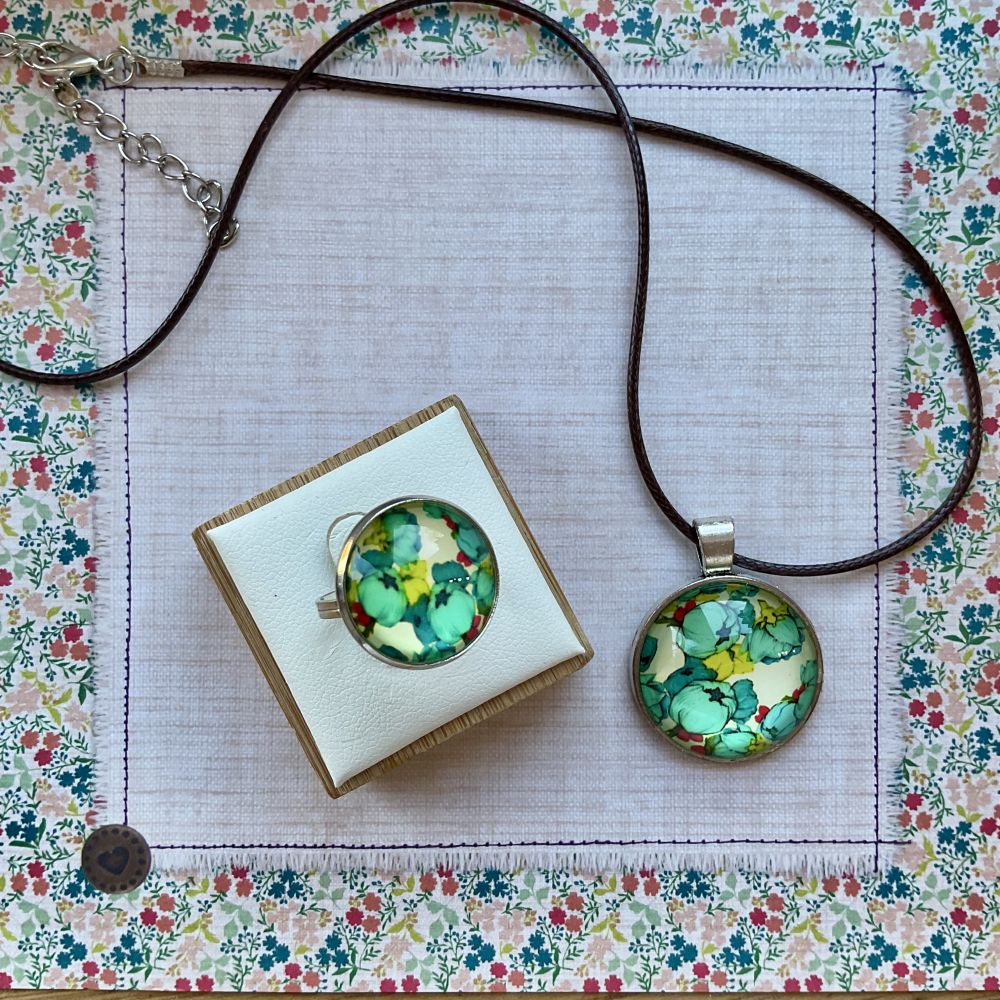The cabochon in the necklace is 25 mm in diameter, and the one in the ring is 18 mm. The necklace’s chain is 45 cm long ,with breaded leather cord and wax surface. Adjustable with Lobster clasp.