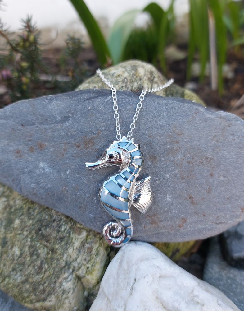 This beautifully crafted pendant is 45mmX22mm in size. The Sterling Silver seahorse is inlayed with blue Mother of Pearl. A chain is sold separately.